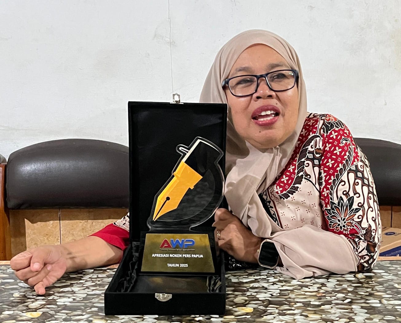 NABIRE, timikaexpress.id — Jurnalis senior Nunung Kusmiaty menerima Apresiasi Noken Pers Papua dari Asosiasi Wartawan Papua (AWP) pada penutupan Festival Media se-Papua Raya yang digelar di Nabire, Ibu Kota Provinsi Papua Tengah, Kamis (16/1/2026).